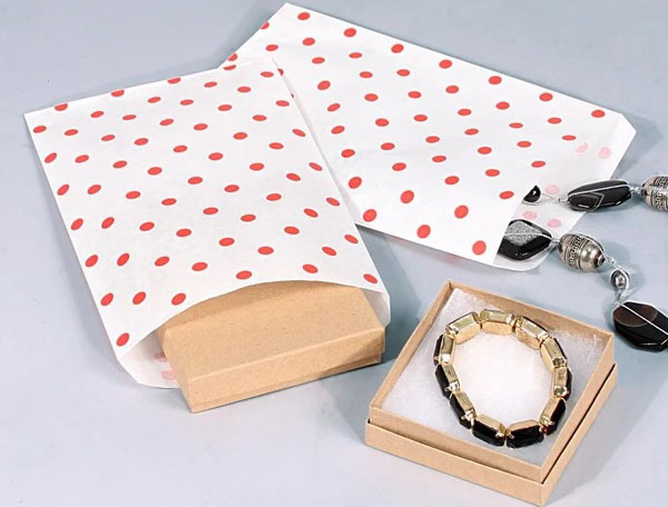 Because my jewelry shop sells vintage-style jewelry, I wanted gift bags with a vintage feel to it. The red polka dot pattern is perfect, as they remind of the Rockabilly style, and kraft paper bags with old newspaper and damask designs are perfect for my minimalist jewelry. Fortunately, Nile Corp sells both of them.